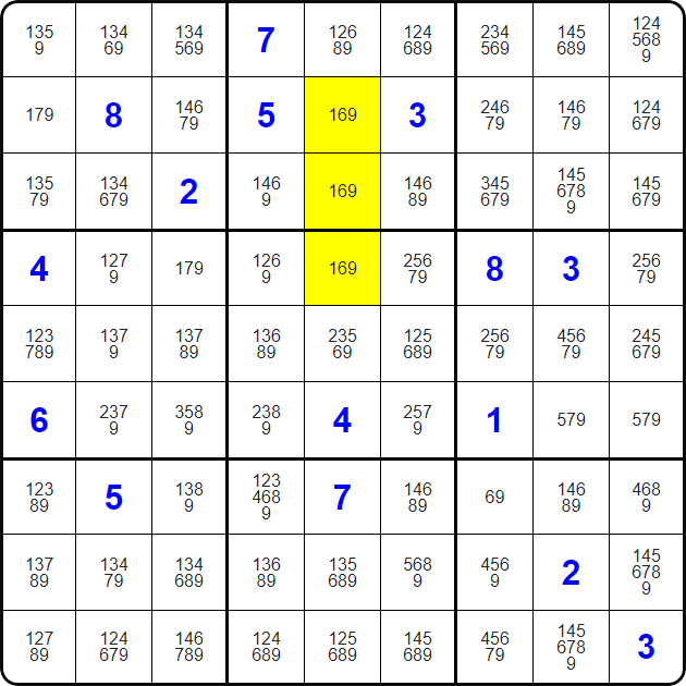 None of the marked cells here can have a 1, a 6, or a 9. We can remove those hints.